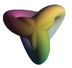 restart: with(plots): A:=unapply(34.+4.79*sin(6*u-Pi/3)+6.73*sin(3*u-Pi/6),u,v); B:=unapply(34.+4.79*sin(6*u-Pi/3)-6.73*sin(3*u-Pi/6),u,v); a:=unapply((A(u,v)^2-B(u,v)^2)/(sqrt(A(u,v)^2+B(u,v)^2)) b:=unapply(sqrt(A(u,v)^2+B(u,v)^2)+A(u,v)*cos(v)+B(u,v)*sin(v),u,v); alpha:=(u)->Pi/8*sin(3*u); x:=unapply(a(u,v)*cos(u)-b(u,v)*sin(alpha(u))*sin(u),u,v); y:=unapply(a(u,v)*sin(u)+b(u,v)*sin(alpha(u))*cos(u),u,v); z:=unapply(b(u,v)*cos(alpha(u)),u,v); f:=(u,v)->evalf([x(u,v),y(u,v),z(u,v)]); setoptions3d(title=`Boy Fläche`,style=PATCHNOGRID,scaling=CONSTRAINED, plot3d([evalf(x(u,v)),evalf(y(u,v)),evalf(z(u,v))],u=0..Pi,v=0..2*Pi);